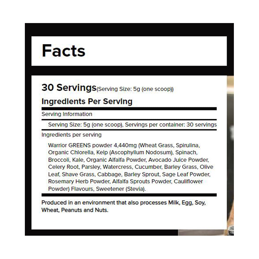 Warrior Greens Supplement in refreshing Green Apple flavor is a daily wellness formula designed to support overall health, energy, and digestive balance. Each 150 g container provides 30 servings of a nutrient-dense blend of greens, including spinach, kale, and spirulina, carefully selected to deliver essential vitamins, minerals, and antioxidants.